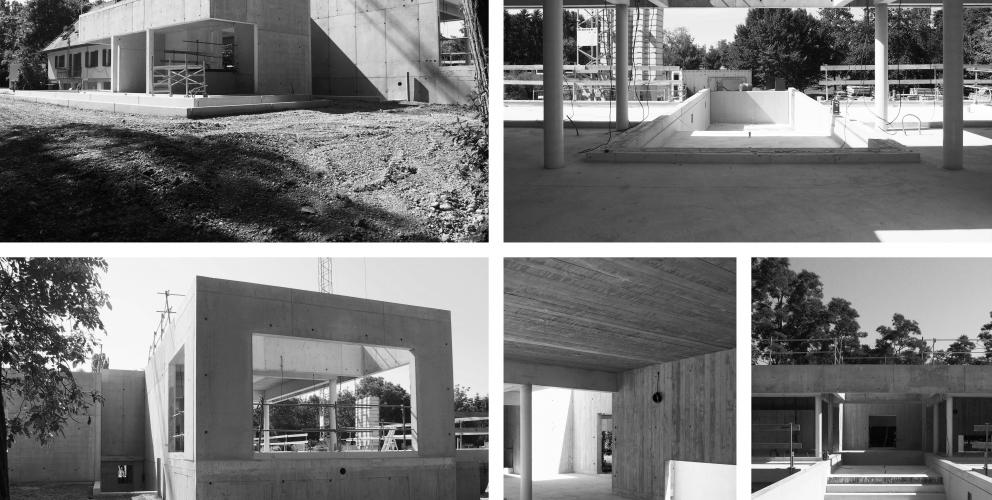 Le portique en béton (abritant et liant les différents éléments constituant le programme) et la terrasse en saillie matérialisent un plateau, une scène (au sens théâtral du terme) dont le sens de lecture est double : une scène à travers laquelle on peut apprécier un paysage verdoyant, comme l'on admire une toile romantique par exemple, mais également une scène sur laquelle s'expose la vie quotidienne de ses usagers, sans artifice aucun.