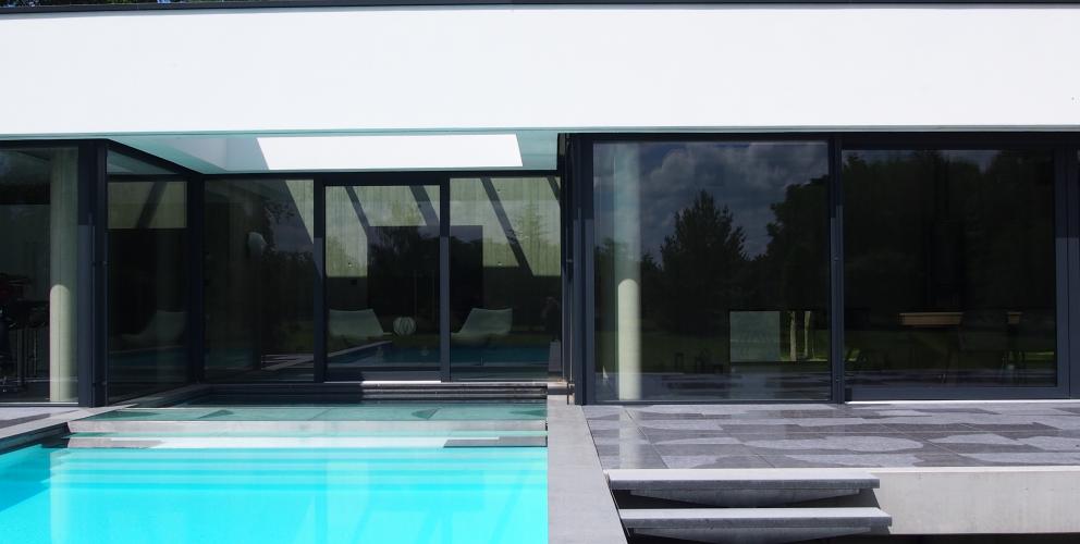 La transparence de l'architecture vient abolir les frontières traditionnelles entre l'intérieur et l'extérieur. Cette volonté de s'affranchir des notions de limite est accentuée par deux éléments forts : les différents patios venant garantir une luminosité optimale dans les espaces à vivre, et l'inscription particulière de la piscine, littéralement encastrée dans le bâtiment. Dès lors, elle semble trouver sa source au coeur du séjour, se retrouve canalisée dans un volume en béton émergeant du sol, pour enfin venir se déverser dans le jardin, comme une cascade.